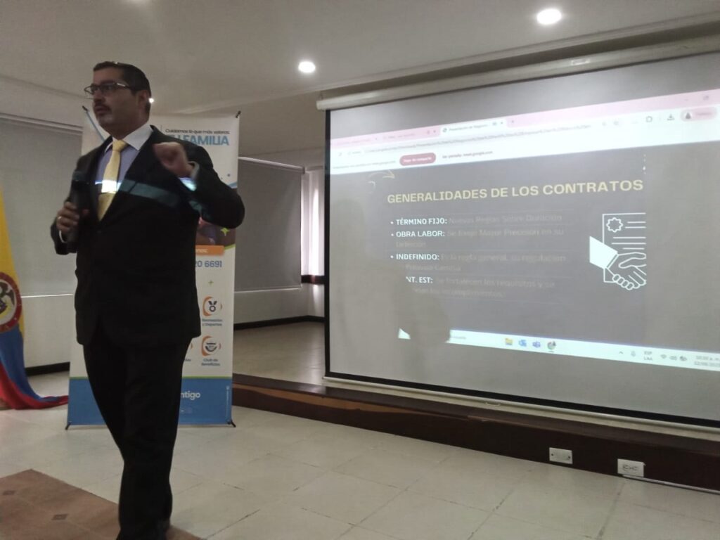 El conferencista fue el doctor Felipe Ballén Garavito, Abogado especialista en Derecho Laboral y de la Seguridad Social quien con gran claridad abordó puntos clave como los diferentes estilos de contrato, donde lo más llamativo es lo relacionado con los contratos para practicantes universitarios y las opciones para vincular aprendices del SENA.